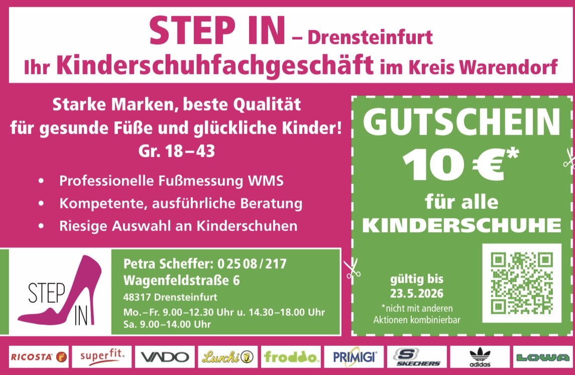 Unser Schuhhäuser in Drensteinfurt verfügen über eine Schuh-Kompetenz seit 1870. Ob Damenschuhe, Herrenschuhe oder Kinderschuhe, wir führen Klassiker und die neusten Trends: Sandalen, Sandaletten, Dianetten Mokassins, Peeptoes, Pantoletten, Slings, Pumps, High-Heels, Stilettos, Trekking-Schuhe, Halbschuhe, Outdoor-Schuhe, Budapester Boots, Stiefel etc. Ein Besuch lohnt sich aus Warendorf, Ahlen, Sendenhorst, Everswinkel, Münster, Hamm, Lüdinghausen und Ascheberg.